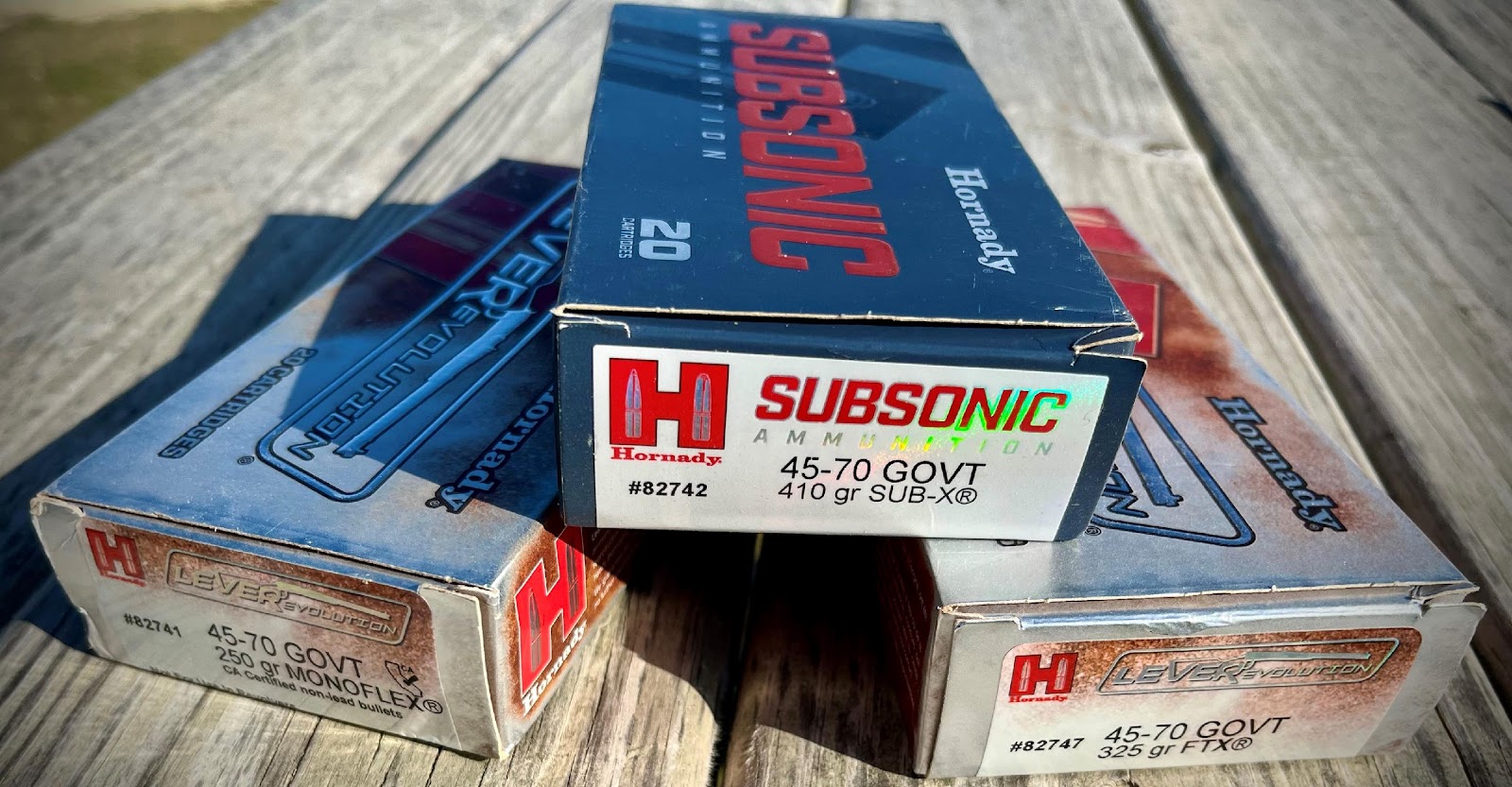 Hornady has been making .45-70 ammunition for many years. Their .45-70 Leverevolution 325gr and .45-70 250gr ammunition have both been used by the author to take whitetail deer out to 205 yards. Their latest offering, a 410gr Sub X Subsonic loading, is available for those desiring decreased recoil and noise, particularly with use of a suppressor.